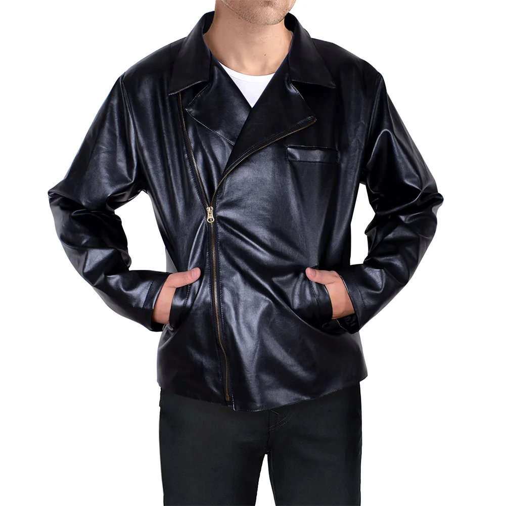 Black PU Leather T-birds Jacket Grease Movie Cosplay Costume 1950s Zipper Biker Jacke Halloween Fan
