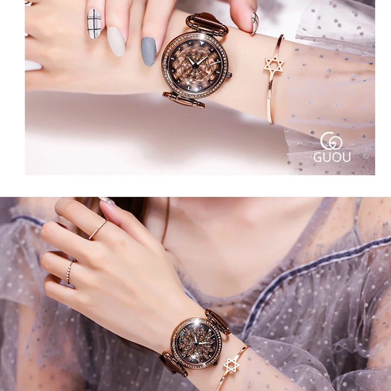 TOP luxury rotating exquisite flower ladies watch fashion rhinestone leather waterproof quartz clock ho